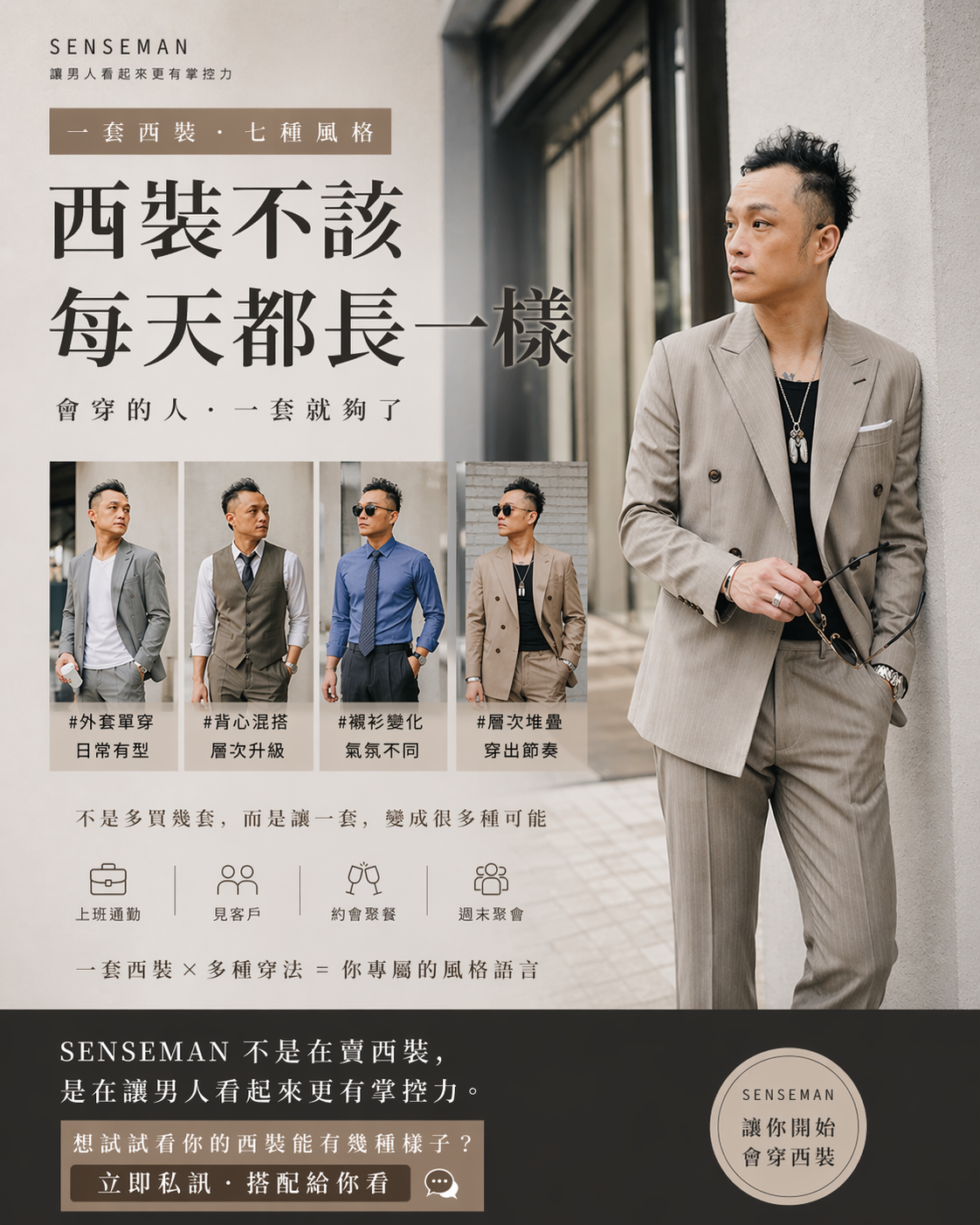 許多人認為西裝只能出現在婚禮、會議或正式場合,但其實真正好穿的西裝,不該只存在於特定時刻,而是能自然融入日常生活。無論是上班通勤、商務拜訪、約會聚餐,甚至週末聚會,只要懂得搭配,一套西裝就能穿出多種風格。