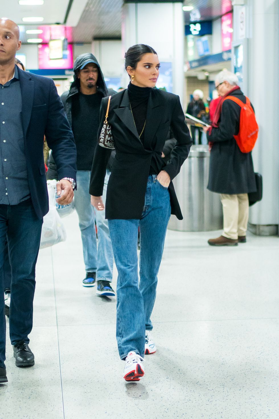 Kendall Jenner的穿搭則更偏向休閒風,她選擇將西裝外套與丹寧褲和球鞋結合,展現出年輕且活力十足的街頭風格。這種搭配既時尚又舒適,非常適合日常穿著。