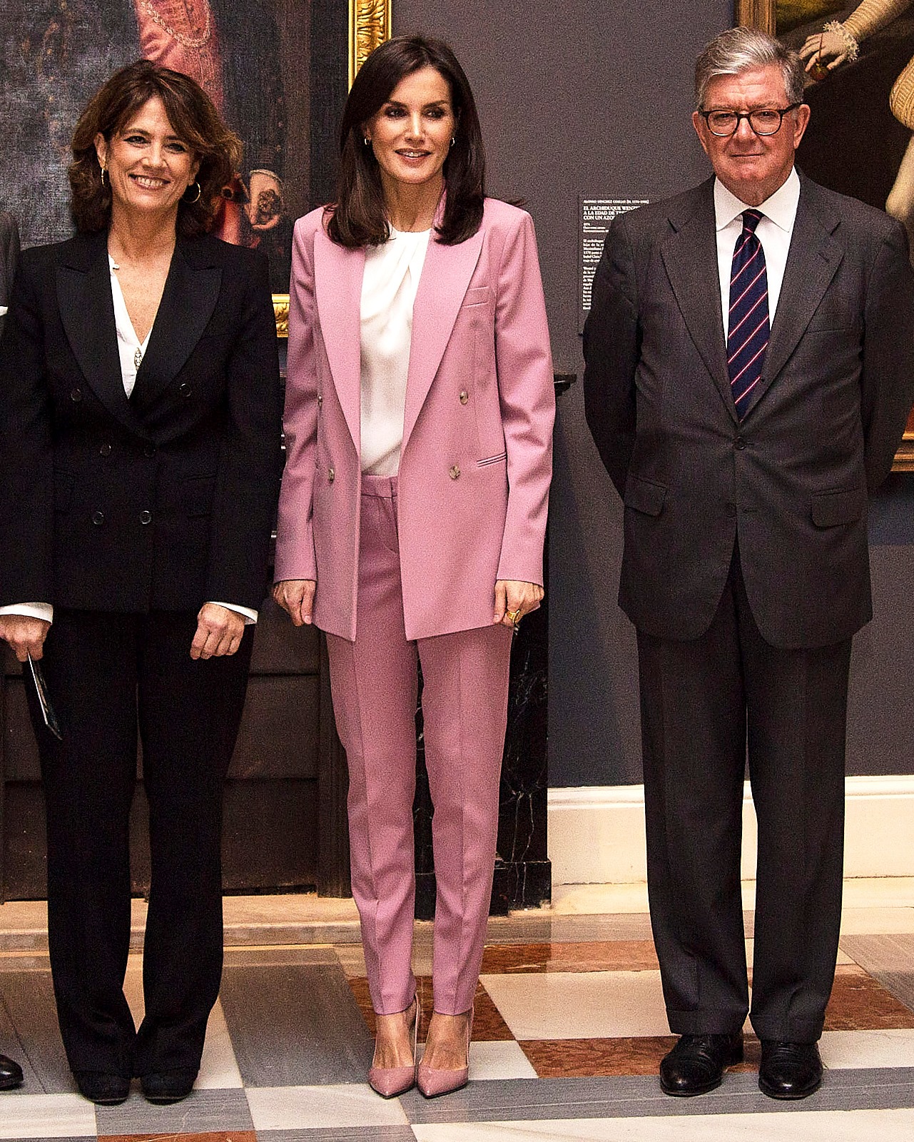 王后萊蒂西亞選擇了粉紅色西裝,搭配了一件簡約的白色內搭和粉紅色高跟鞋,專業又不失女性柔美。她的搭配技巧包括選擇合身的西裝剪裁和簡潔的配飾,這樣既突出了她的個人氣質,又保持了皇室的典雅風範!