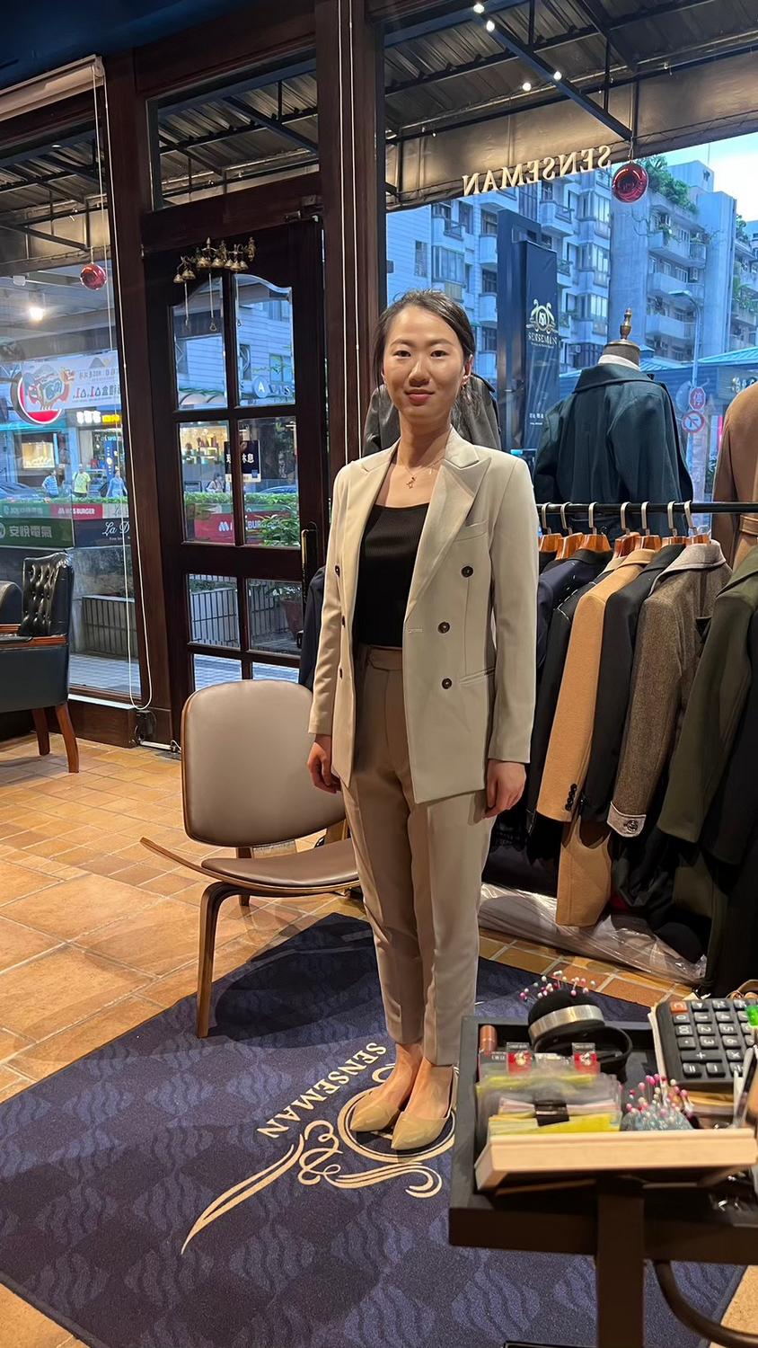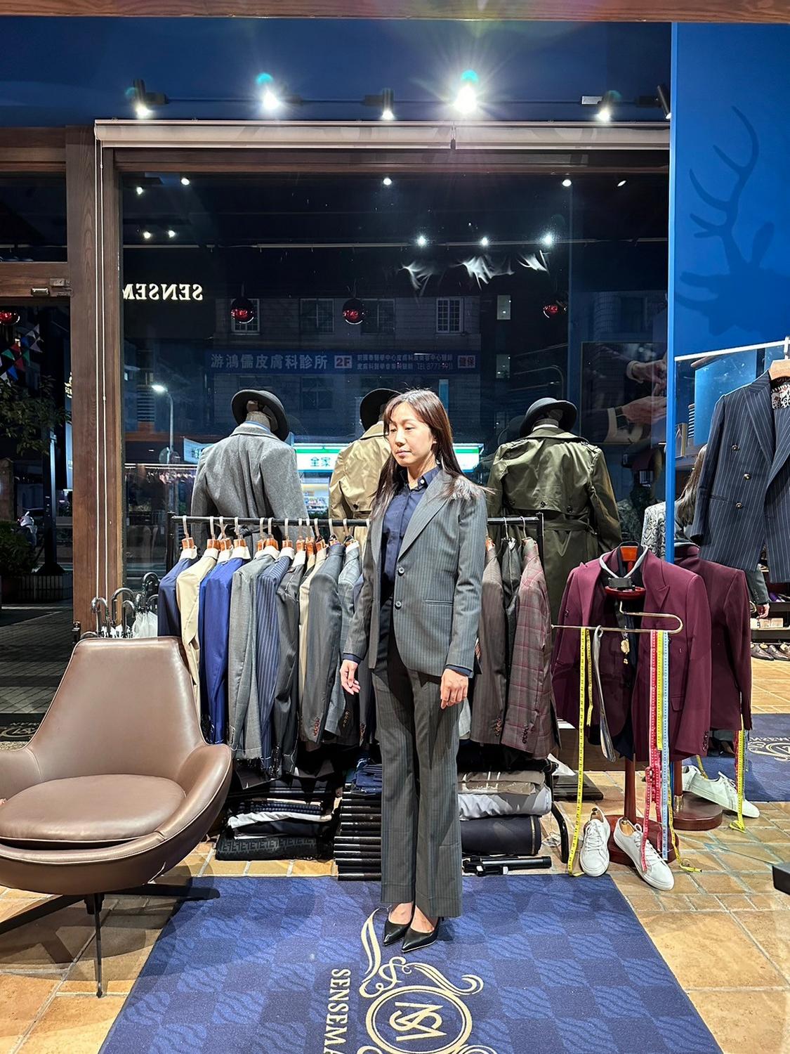 她要的西裝是讓整體風格 乾淨、內斂,又保有質感,方便提升自己的氣勢,方便管理更多的夥伴。試穿當天,對著鏡子笑說:「這感覺好棒、全新體驗,俐落專業的我。」